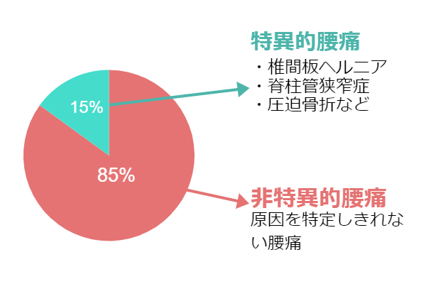 この二つの割合が問題で、日本整形外科学会が発行している「腰痛診療ガイドライン」によると、腰痛の85%は非特異的腰痛に分類され、原因を特定することが困難であると記載されています。